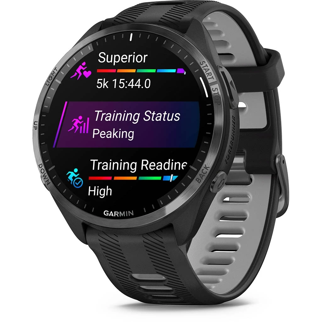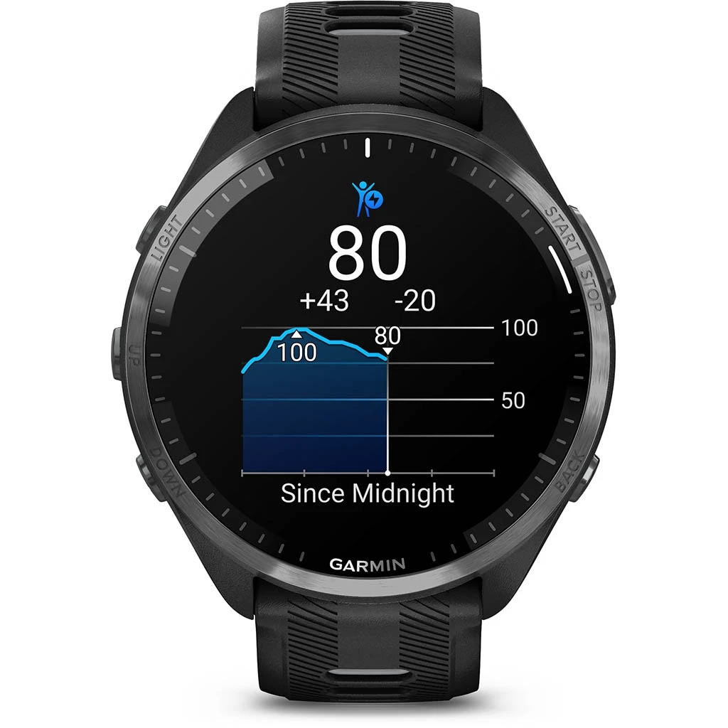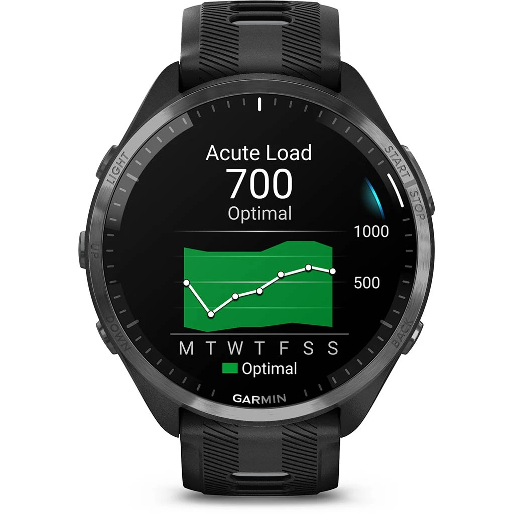La Forerunner 965 est Ă©quipĂ©e d’une fonctionnalitĂ© unique de puissance en course intĂ©grĂ©e pour suivre en temps rĂ©el la puissance que vous appliquez sur les chemins ou sur la route lorsque vous courez. Elle dispose Ă©galement d’une fonction de ratio de charge qui permet de suivre le rapport entre votre charge sur 7 jours et votre charge aigĂĽe pour mieux gĂ©rer l’augmentation de charge, rester en forme et Ă©viter les blessures.
