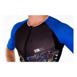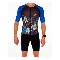 Le singlet de triathlon pour homme Zerod Racer TTSinglet, est ici décliné en noir et bleu. Il est conçu pour deux fonctions : améliorer l’aérodynamisme et diminuer l’effet de traînée lors de la course.